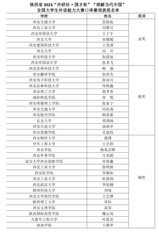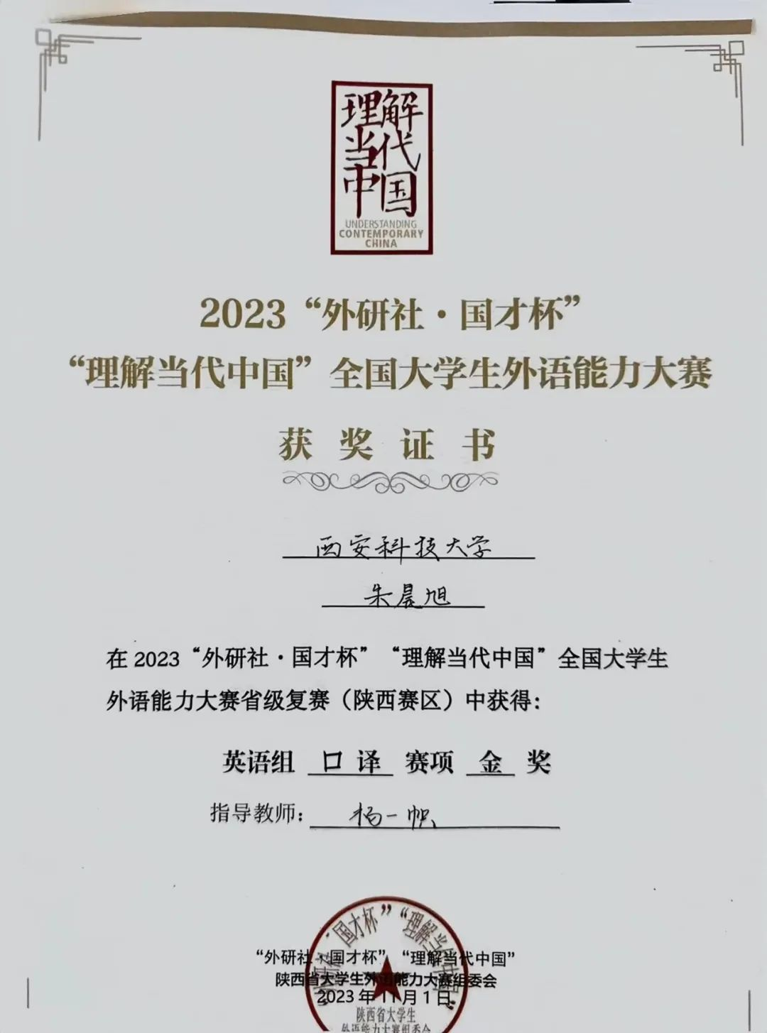 11月5日,“2023‘外研社·国才杯’‘理解当代中国’全国大学生外语能力大赛”口译省级复赛(陕西赛区)在西安外国语大学长安校区落幕。球王会体育官方网站朱晨旭同学获得英语组口译赛项金奖,顺利晋级国赛。