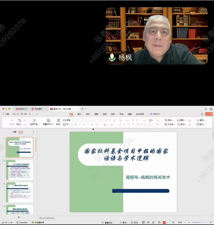 在2024年国家社会科学基金项目申报的关键时段,2月29日晚,球王会体育官方网站邀请上海交通大学外国语学院博导杨枫教授给我院教师开展了线上讲座:《国家社科基金目申报的国家话语与学术逻辑》。本场讲座由我院副院长张辉主持,院长王新平致辞欢迎并总结发言,学院全体教授、副教授、硕士生导师、学科团队教师与研究生参加。