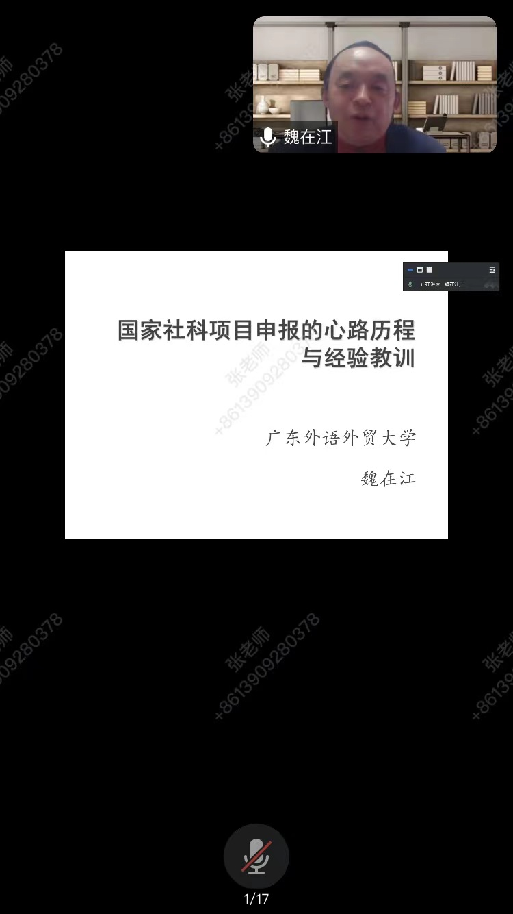 在2024年国家社会科学基金项目申报的关键时段,2月28日晚,球王会体育官方网站邀请广东外语外贸大学“云山杰出学者”、英语语言文化学院博导魏在江教授给我院教师开展了线上讲座:《国家社会科学项目申报的心路历程与经验教训》。本场讲座由我院副院长张辉主持,院长王新平致辞欢迎并总结发言,学院全体教授、副教授、硕士生导师、学科团队教师与研究生参加。