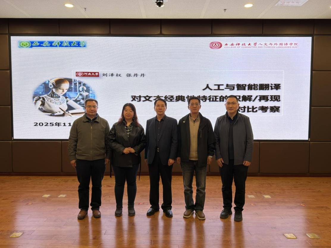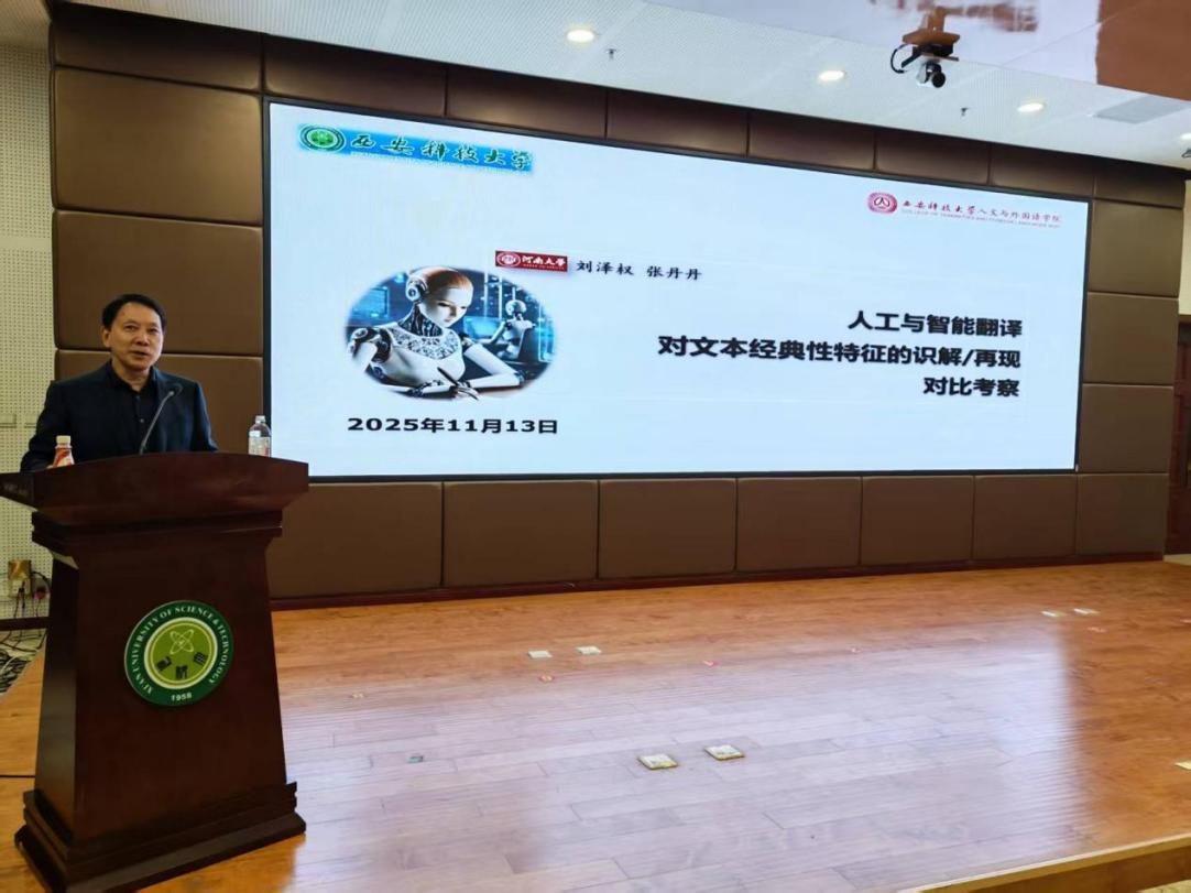 2025年11月13日晚7时,河南大学二级教授、博士生导师、河南省特聘教授刘泽权应邀来到球王会体育官方网站“胡杨林大讲堂”,在骊山校园煤炭科技楼二楼报告厅作了题为“人工与智能翻译对文本经典性特征的识解/再现实证考察”的学术讲座。本次讲座由学院张辉副院长主持。时健教授等教师代表及200余名学生到场聆听。
