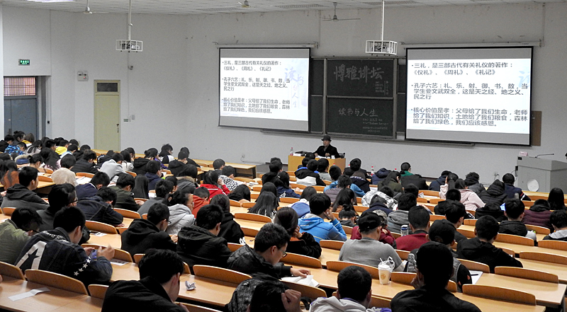 在报告中,孙见喜结合自己多年读书的体会与感受,采取讲故事、唱民歌、朗诵诗作等方式,为大家生动解读了读书的目的、方法、趣味、教益以及读书与民族精神的生成等问题,并以儒家文化结构图和中华道德发展延续图为例,提出读圣贤书是为中国伦理道德补课的观点,希望大家能够多读书、读好书、善读书,通过读书提高修养,培养独立思想和独立人格,积极为传承弘扬中华优秀传统文化、塑造以“良心(道德的自觉意识)”为基础的民族魂而尽一份力量。报告内容丰富详实,语言生动幽默,情感充沛热烈,说理深邃透彻,受到与会师生的热烈欢迎。