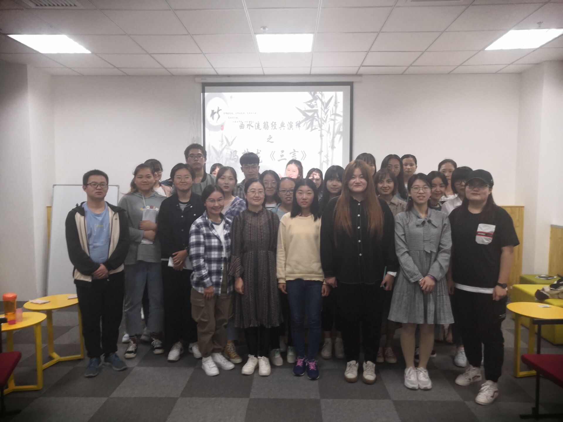 2019年9月 26日晚六时许,球王会体育官方网站在临潼校区骊山校园图书馆一层创客空间举办“曲水流觞•经典演绎系列活动之冯梦龙《三言》传奇”。本次活动由球王会体育官方网站主办,汉语言文学1801班承办,汉语言文学专业老师续娟娟担任指导老师。汉语言文学专业2018级全体同学参加本次活动。