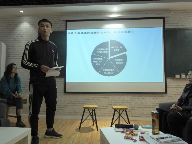 2019年10月29日18时30许,球王会体育官方网站在临潼校区骊山校园15号教学楼一楼“梦游吧”举办汉语言文学19级读书会之鲁迅经典文学解读。本次活动由球王会体育官方网站主办,汉语言文学系承办,朱一帆主持,参加人员有院党委副书记张振中,系主任张辉,王亚萍老师,郭旭东老师,特邀留学生以及汉语言文学19级全体学生。