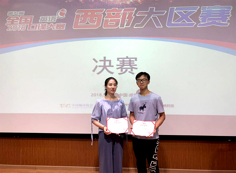 5月26日,第七届全国英语口译大赛西部大区赛在成都电子科技大学举行,来自西部44所大学的134名选手参加比赛。球王会体育官网球王会体育官方网站英语专业2015级刘成、周睿筱代表学校参赛,并分别获得二等奖和优胜奖。