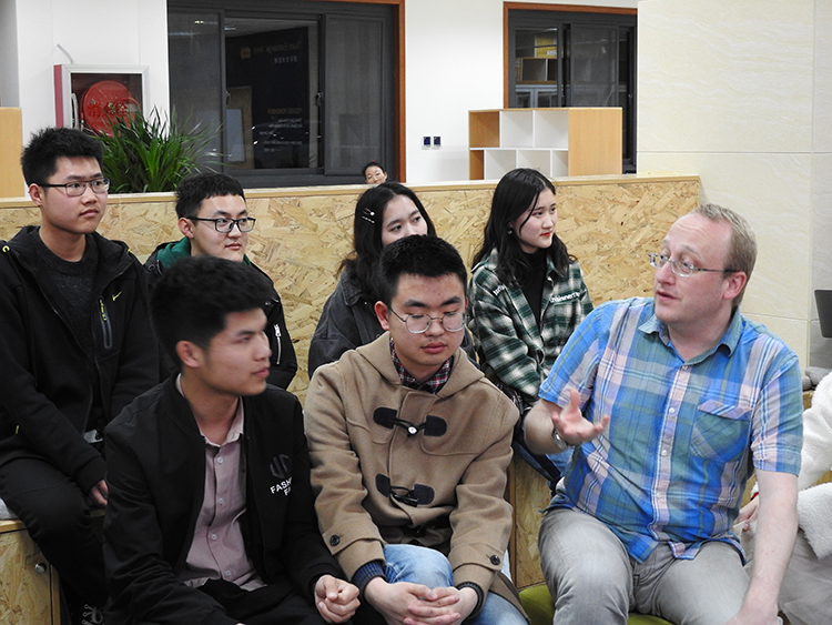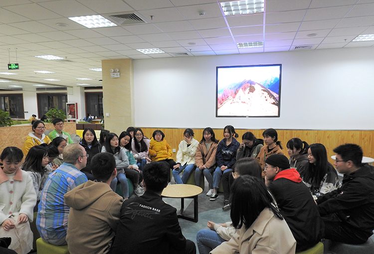 阳春三月,春意渐浓。3月15日晚7点整,球王会体育官方网站新学期第一次“英语角”活动在临潼校区骊山校园图书馆一层创客空间正式启动。本次活动由英语1601班主办,班级全体成员及部分英语爱好者参与活动。外教James与同学们环坐详谈,对同学们感兴趣的留学、工作、国际问题等话题一一展开,进行了认真的分析。
