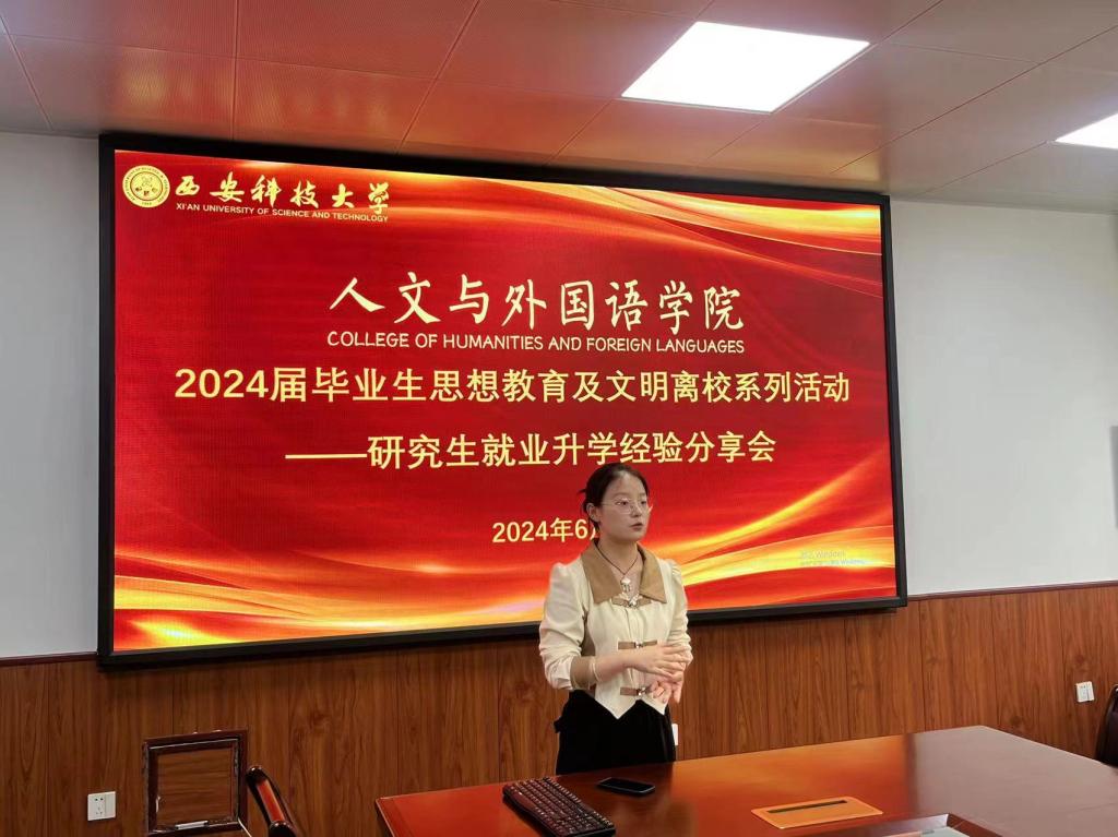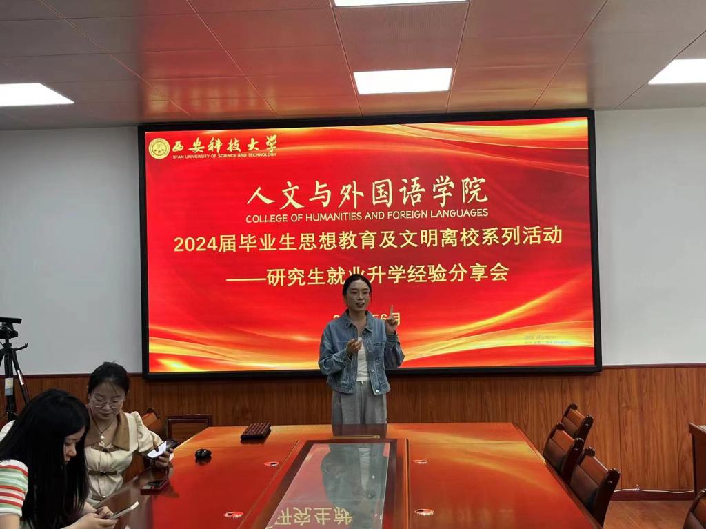为做好2024届研究生毕业生文明离校工作,引导毕业生认真学习贯彻习近平新时代中国特色社会主义思想,自觉把个人理想追求融入国家和民族的事业中,争做有理想、敢担当、能吃苦、肯奋斗的新时代好青年,6月4日下午,球王会体育官方网站在临潼校区骊山校园学院226会议室举办2024届毕业生思想教育及文明离校系列活动—研究生就业升学经验交流会,2024届毕业研究生,2023级、2022级全体在校研究生参加了活动,活动由研究生辅导员芮智刚主持。