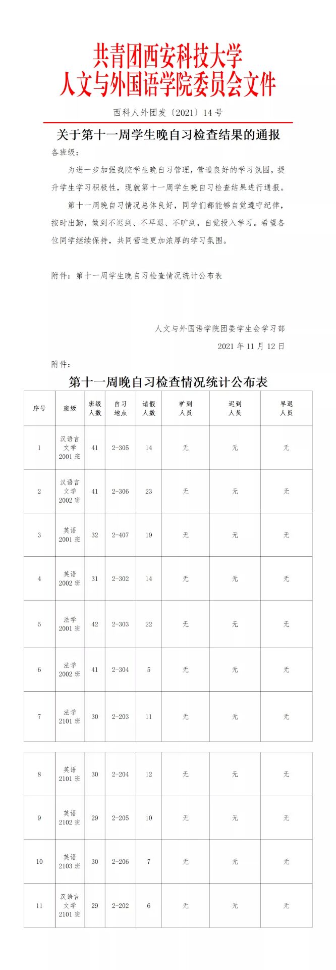 孔子曰:温故而知新,可以为师矣。大学生活的学习,很重要的便是学新知,习旧知,预未知。晚自习所提供的的这样一个集体学习的平台,有助于我们逐渐形成自行规划,自主学习的能力。晚自习检查结果汇总如下: