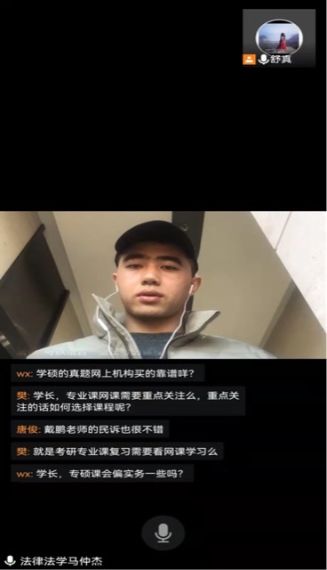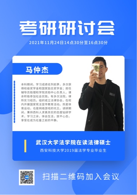 11月24日,球王会体育官方网站法学系召开了线上考研研讨会,研讨会由舒真主持,武汉大学在读法律硕士、球王会体育官方网站法学2015级本科生马仲杰主讲,全体法学专业学生参加。