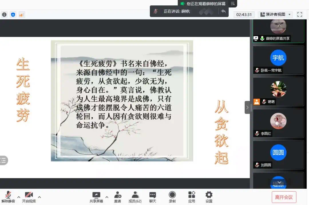第二组分享的作品是《生死疲劳》,小组代表薛婷、张一甜、韩羽馨解读时点明该作品是作者土地情节的一次集中释放。“土地”是小说的主题,是人的根本,也是最终的归宿。