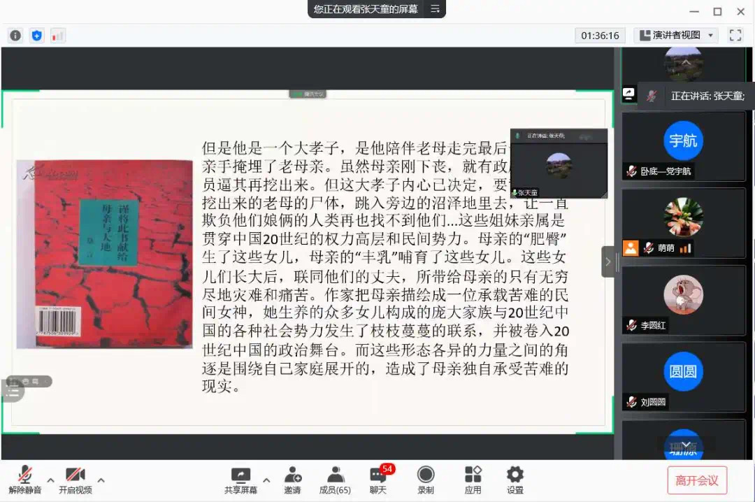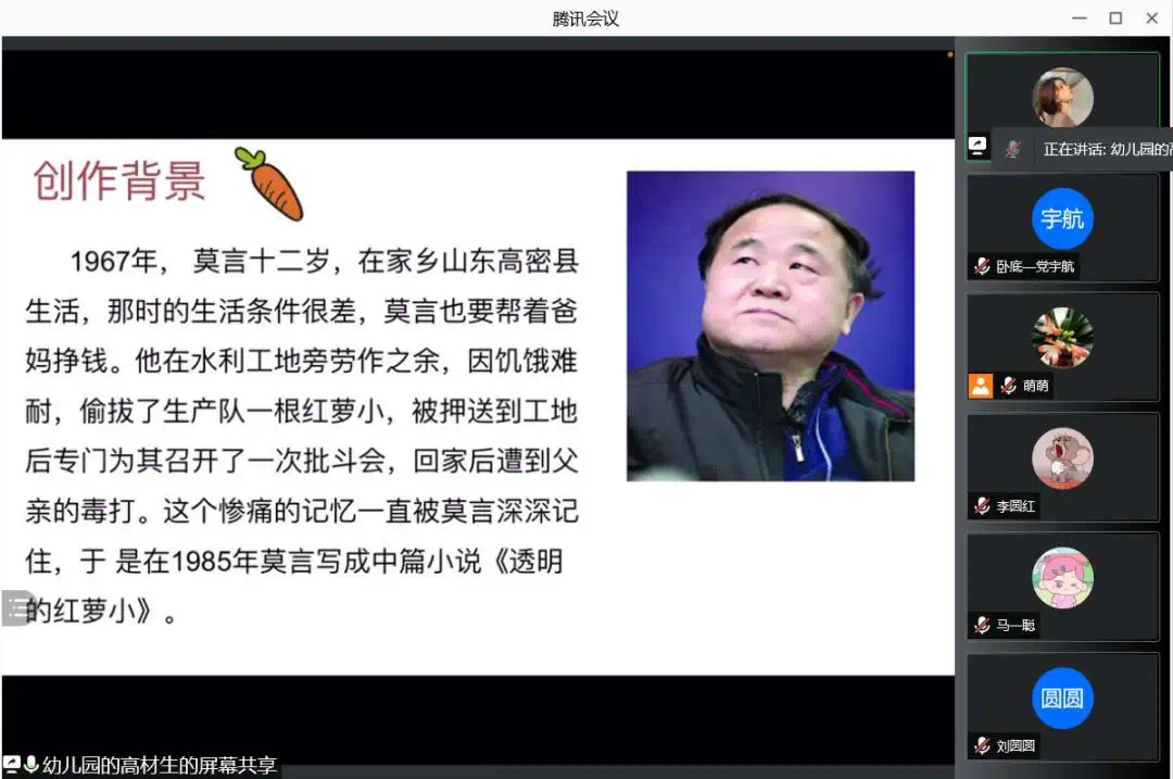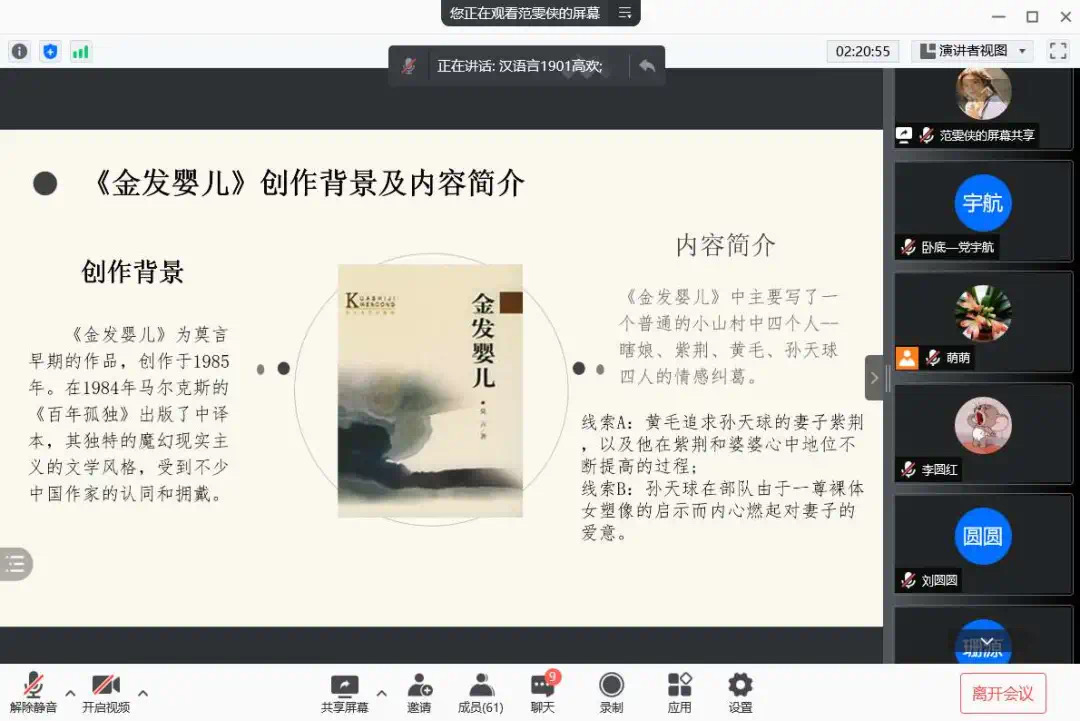 为了使大家多读书,好读书,读好书,并且“熟读而精思”,2021年10月11日,球王会体育官方网站汉语言文学专业举办了以“莫言的小说”为主题的线上读书交流会。指导老师郭萌及汉语言文学专业19级全体同学参加活动。