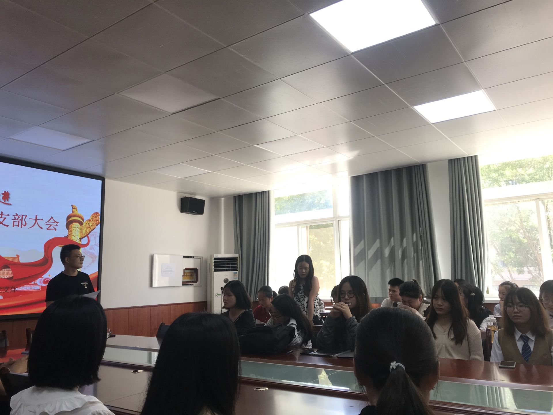 随后高琬莹、李双珍两位同志分别向党组织汇报她们在预备期间的表现、情况,之后入党介绍人提出同意高琬莹、李双珍同志转正。接着樊杰杰同志传达党组织意见,同意两位同志成为一名正式党员。之后其他各位同志依次发言,谈了两位同志在学习、生活等多各个方面的情况。