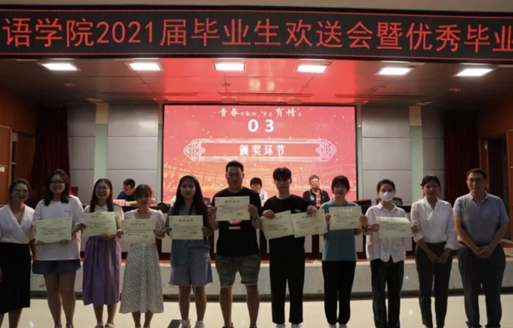 会上,学院副院长叶江宣读《球王会体育官方网站关于表彰2021届毕业生先进集体及优秀个人的决定》。在欢快的乐曲声中,与会领导和全体教师代表分别为获得优秀毕业生、考研奖、基层志愿服务奖、优秀共产党员、优秀学生干部、就业工作先进个人、优秀宿舍优秀留学生奖的毕业生代表颁了奖,并合影留念。