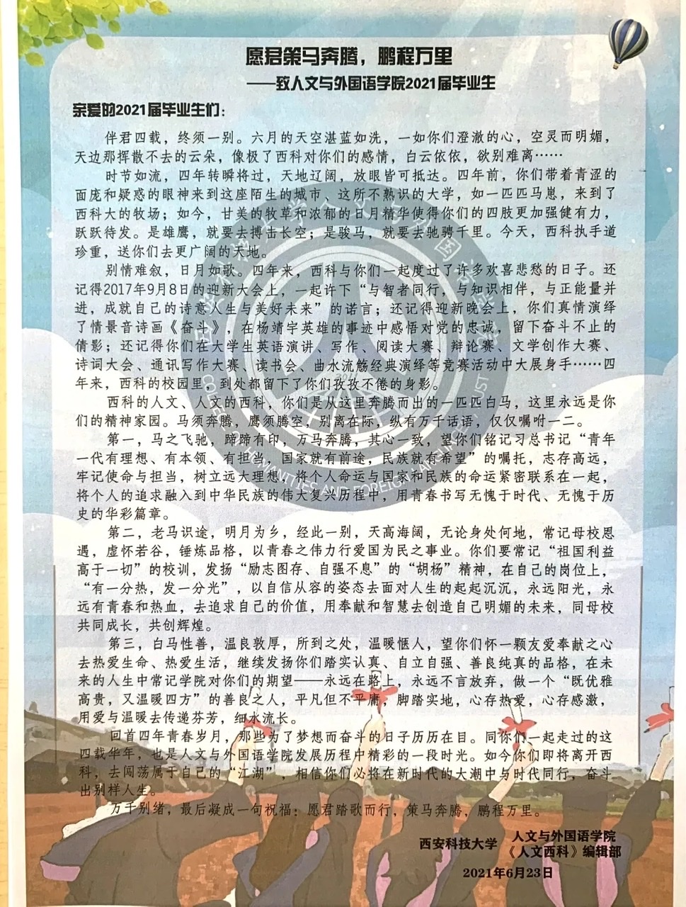 •教师杜戍涓:我将“自我、自信、自强”这三个关键词与大家共勉,希望经年后的你们,还是会有最动人的微笑,最真挚的爱和最浪漫的情怀。无论你们身处何方,人外学院的老师们将一直捧着一颗热爱你们的心,等你们回家。