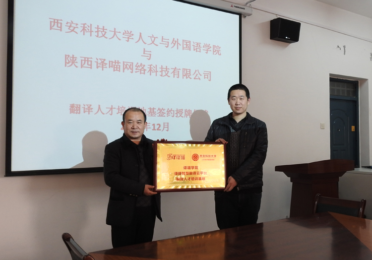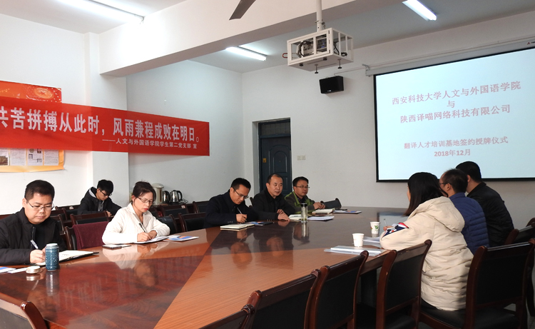 12月5日下午,球王会体育官方网站与陕西译喵网络科技有限公司翻译人才培训基地签约授牌仪式在学院会议室举行。陕西译喵网络科技有限公司总经理王潇轩,球王会体育官方网站院长师新民分别代表双方签订合作协议。学院党委副书记张振中、副院长冯正斌及英语系教师代表参加签约授牌仪式。