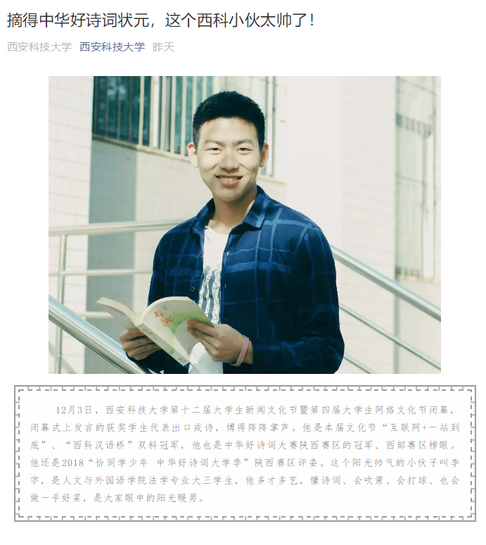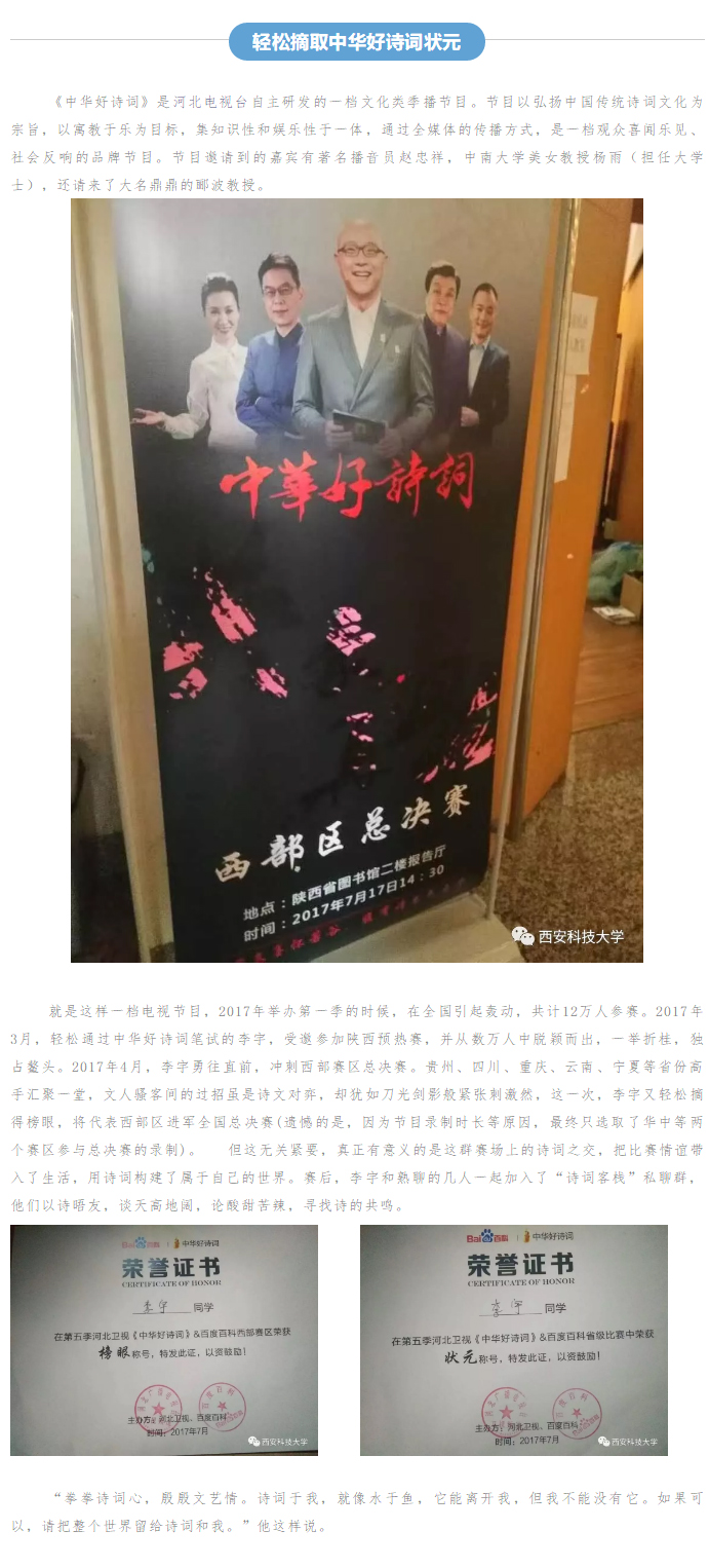 近日,球王会体育官方网站第十二届大学生新闻文化节暨第四届大学生网络文化节落幕,我院法学2016级李宇同学荣获本届文化节“互联网+一站到底”、“西科汉语桥”双料冠军。昨日(12月20日)球王会体育官网官方微信报道了李宇同学的故事。以下是详细报道。