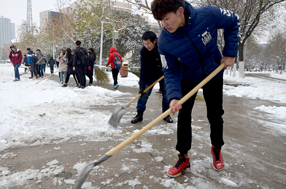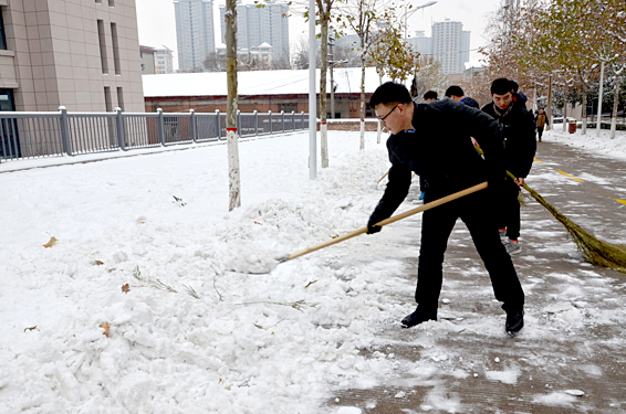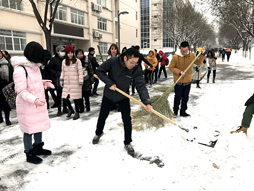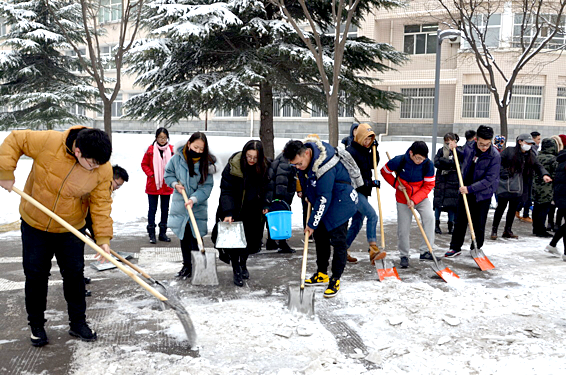 2018年的第一场雪在给大家带来美景与欢乐的同时,也给校园交通和师生的学习生活带来诸多不便。1月4日,球王会体育官方网站党委积极响应学校号召,组织辅导员老师、分团委学生会干部、全体学生党员、入党积极分子、建档立卡学生及部分没有课的学生开展了扫雪除冰活动。在清扫的过程中,师生们不畏严寒,拿着雪锹、除雪铲、扫帚等工具认真清除冻住的积雪,历经三个小时,将二号教学楼周边的环道清扫一条充满爱心的方便之路,为广大师生的出行安全提供了保障。