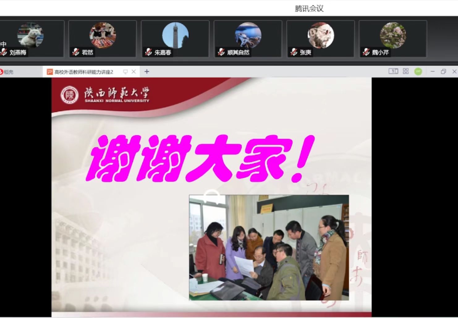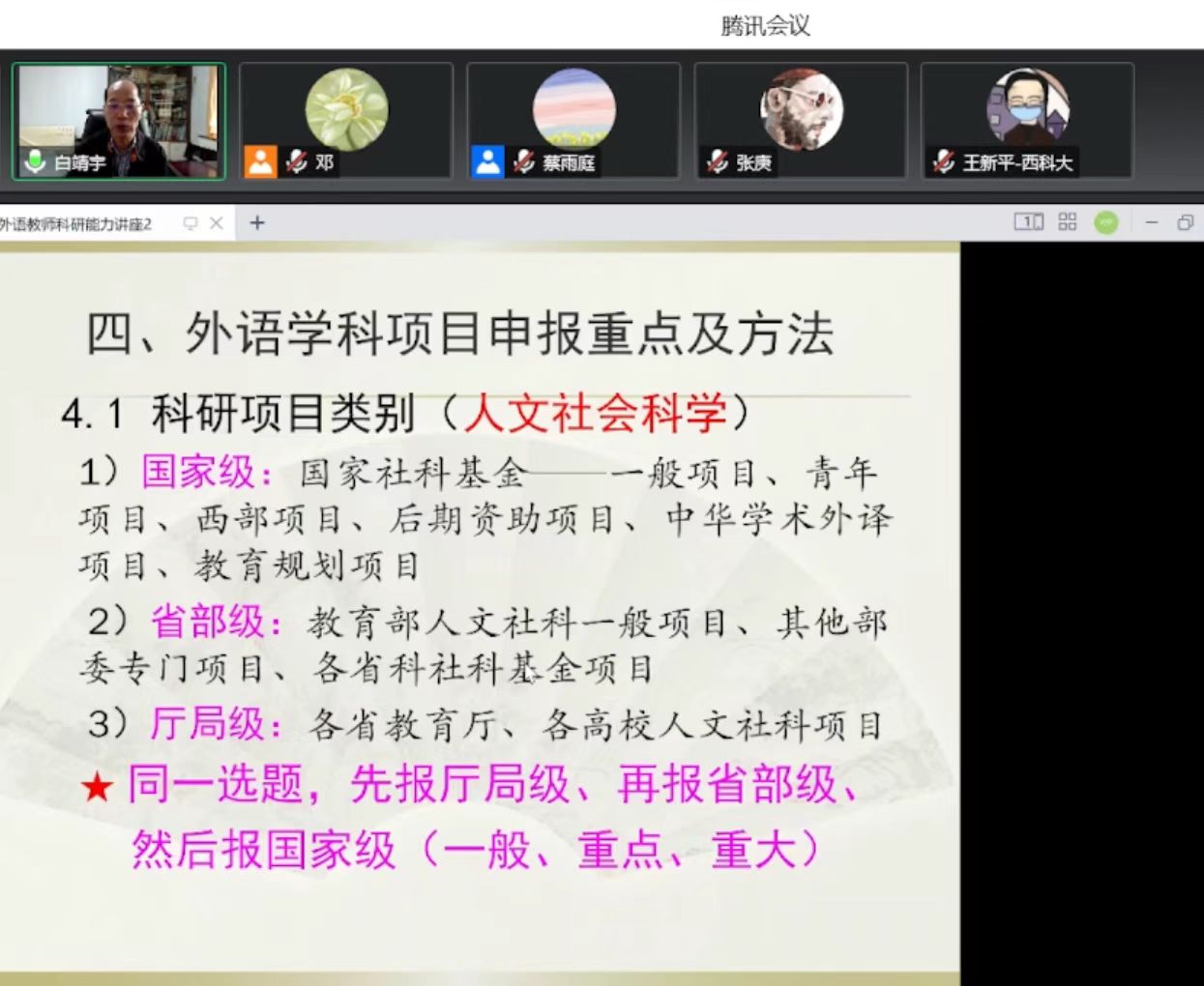 为拓宽科研思路,促进2023年国社基金项目申报工作的开展,球王会体育官方网站及科技处邀请陕西师范大学白靖宇教授,于2022年11月10日下午开展了题为“高校外语教师科研能力提升与国家社科项目选题思考”的线上讲座。讲座由王新平院长主持,球王会体育官方网站的教师与同学们积极参加了此次讲座。