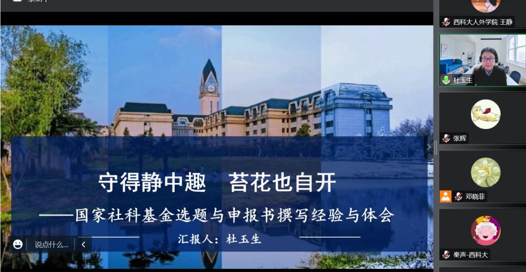 12月6日晚,球王会体育官方网站在腾讯会议召开了国家社科基金项目申报辅导讲座,邀请南京信息工程大学文学院副院长、硕士生导师杜玉生教授担任主讲。讲座由人外学院副院长张辉主持,科技处处长卢小飞,人外学院教师及全体英语系研究生参与讲座并进行了交流。