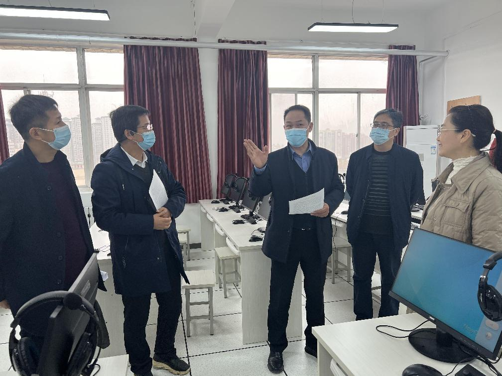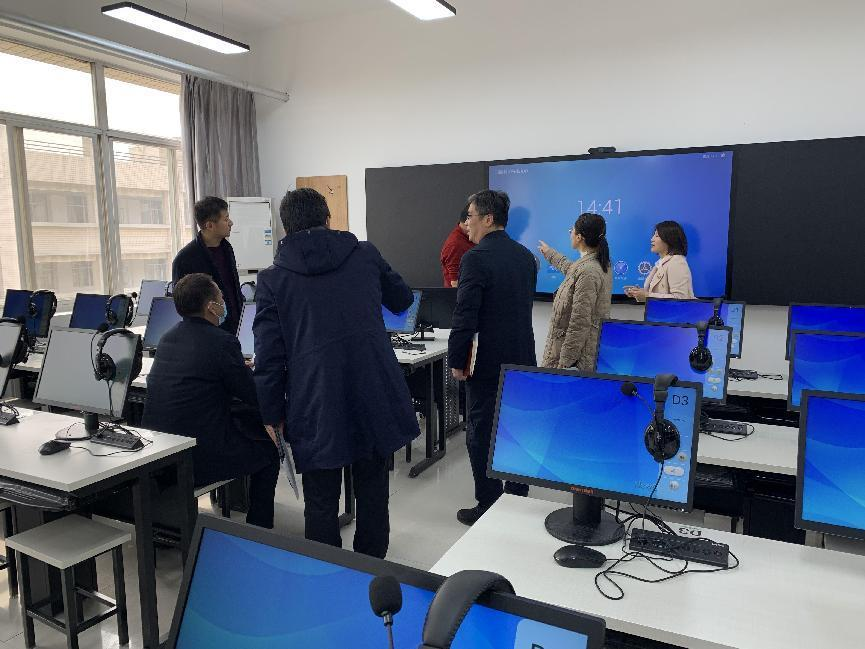 2月28日下午,副校长曹明带队,财务处、国资处处长一行人共同视察球王会体育官方网站实训中心贴息贷款项目和审核评估项目的建设情况。副校长曹明对智慧语言实验室和智慧云语言实验室两个项目建设及使用情况进行了调研,并详实了解了智慧云语音实验室的建设内容及项目进度。球王会体育官方网站院长王新平介绍了学院实验室总体建设过程及具体情况。校领导对人外学院实验室建设工作给予了肯定,并指出不足。曹明表示,要进一步优化“智慧云”优势,充分利用现有资源确保线上线下有效结合,以智能科技提高实验室工作效率,让广大师生通过云技术一体化架构切实体验到现代化实验室带来的便捷。