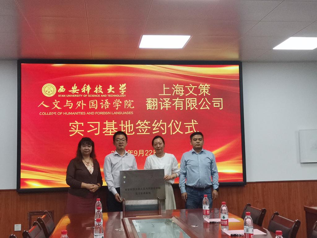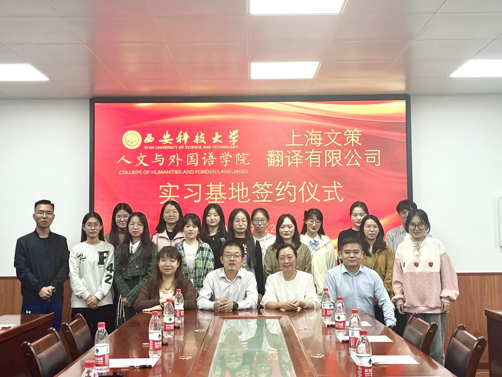 9月22日下午,球王会体育官方网站与上海文策翻译有限公司在骊山校园举行实习实践基地共建签约仪式。上海文策翻译有限公司领导及代表,人文与外国与学院党委书记费秀水,球王会体育官方网站副院长张辉,MTI中心主任张军锋、张梦原,研究生教务办主任邓晓菲,学工办主任、团委书记芮智刚,MTI学生代表等参加签约仪式并进行座谈交流。