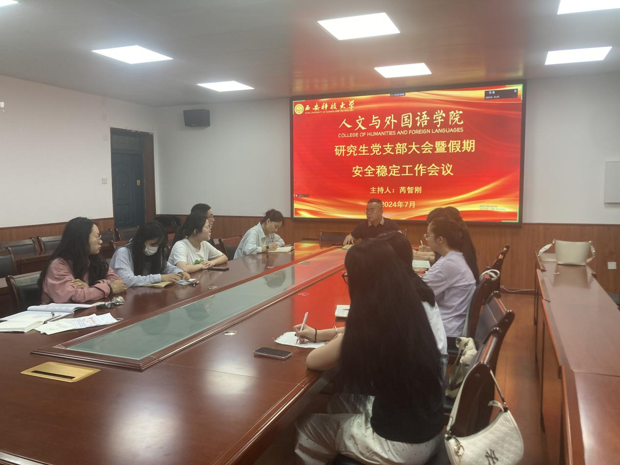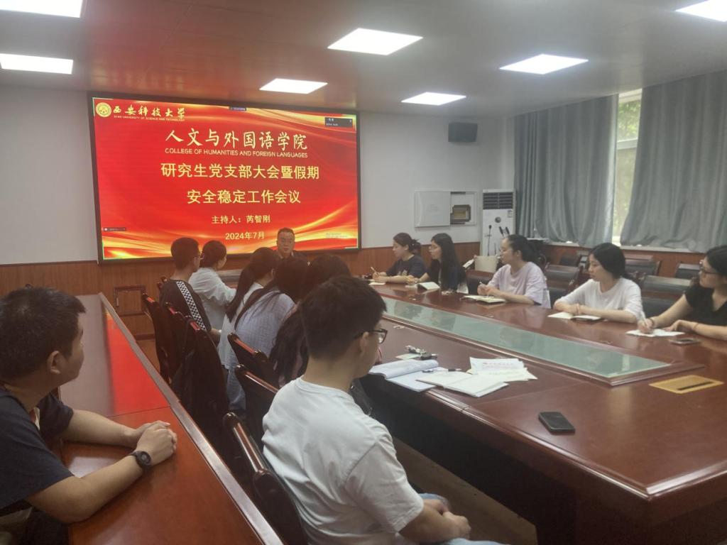 为做好研究生安全稳定工作,7月3日,球王会体育官方网站研究生党支部在临潼校区2教226会议室召开党支部大会暨假期安全稳定工作会议,会议以线上线下相结合的方式召开,全体研究生党员、2023级研究生参加了会议,会议由研究生辅导员芮智刚主持。