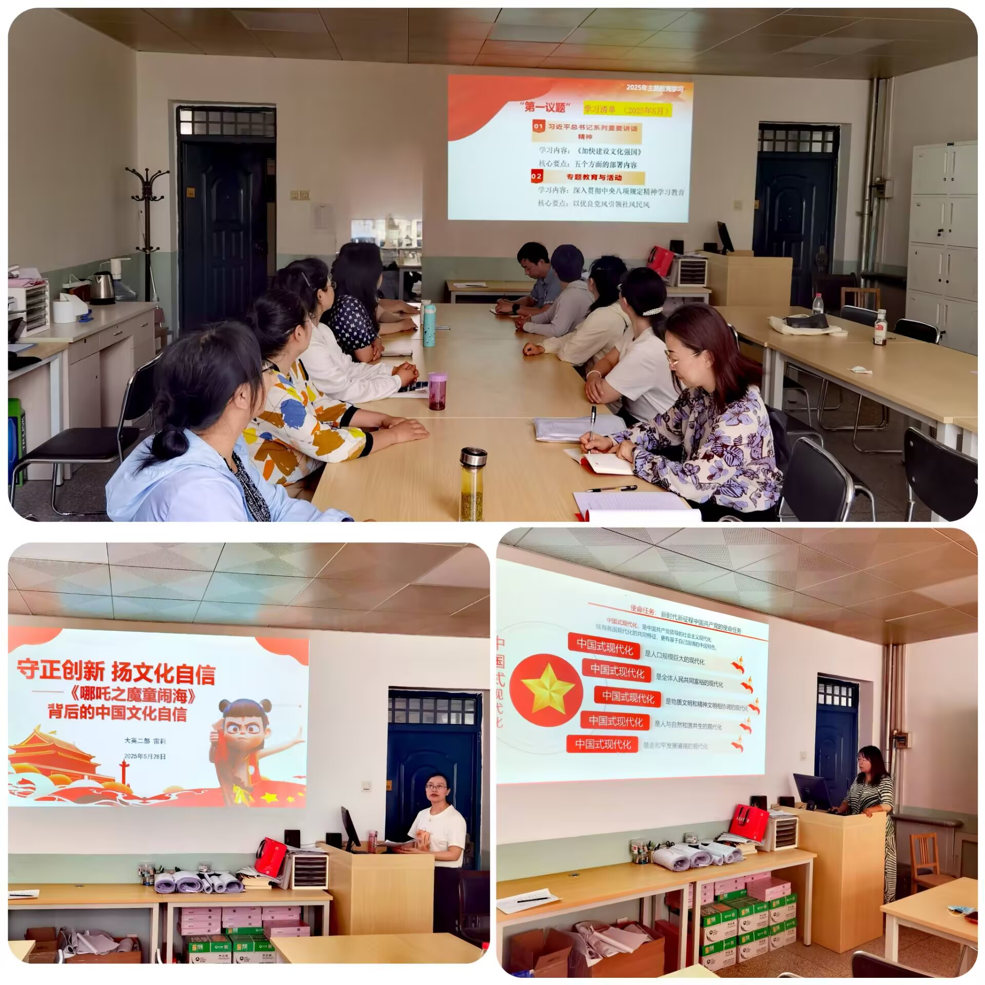 在主题党日活动环节,支部党员雷莉老师示范引领,做了一场题为“《哪吒之魔童闹海》背后的中国文化自信”的微党课。这次微党课教育从影视大众媒介的视野观察思考中国文化建设的内涵以及国际影响力,同志们认真学习,受益匪浅。随后,张辉副院长做了“党的二十大精神解读”系列讲座的第三讲:开辟马克思主义中国化时代化新境界的指导思想。强调了做到“六个坚持”的重要性:坚持人民至上、坚持自信自立、坚持守正创新、坚持问题导向、坚持系统观念、坚持胸怀天下。会上,支部书记王芳领学了习近平总书记重要文章《加快建设文化强国》。
