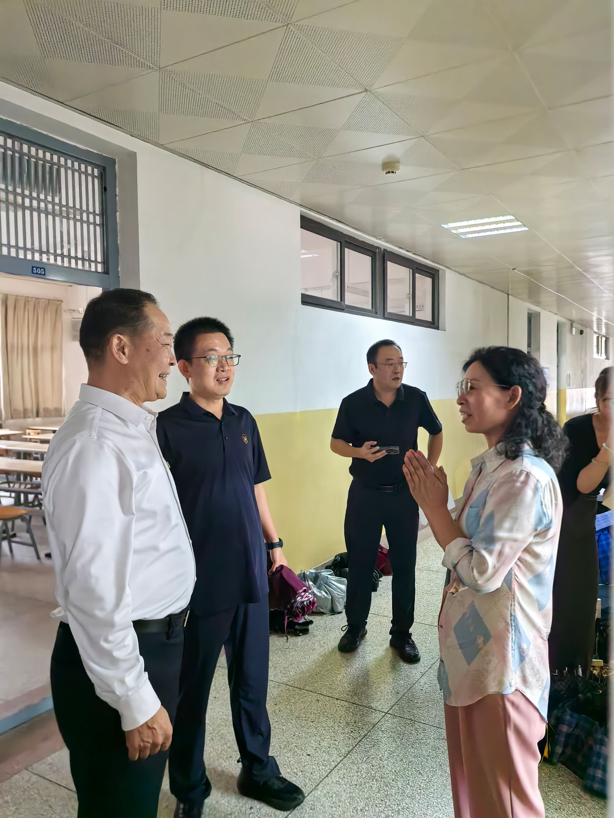 曹明校长一行抵达508教室,与张芸教授亲切握手,代表学校向张芸老师和全院教师致以节日问候,并亲手赠送鲜花,表达对一线教师的敬意。张芸老师对校领导的慰问表示感谢,称将继续做好教学工作,履行好育人职责。曹校长详细询问张芸教授当日的课程安排、班级学生构成和个人工作生活保障等情况,并代表学校对其长期以来的辛勤付出予以高度肯定。